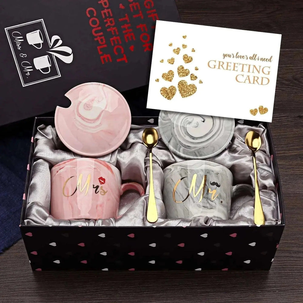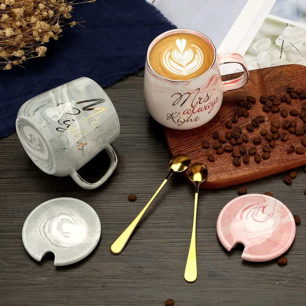 The Mr Right Mrs Always Right Couple Coffee Mugs - Special Gift by Julia M Home & Kitchen are the perfect special gift for bridal showers, weddings, anniversaries, and Valentine's Day. Made of high-quality ceramic marble, this set of drinkware features a stylish design with the Mr Right and Mrs Always Right phrases. Each mug has a capacity of 301-400ml and comes in four different colors: Whether you're enjoying your morning coffee or tea, these mugs add a touch of elegance to your drinkware collection. Order now and choose your shipping location from China, Poland, United States, United Kingdom, Germany, Australia, or France.